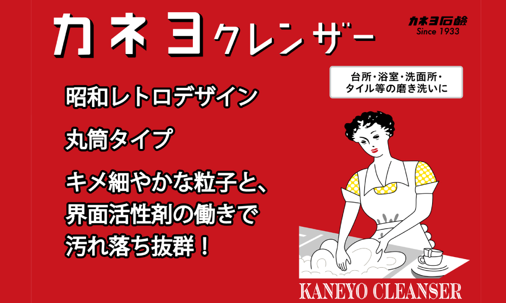 昭和8年の創業『カネヨ石鹸』の台所用洗剤、住居用洗剤、衣料用洗剤、化粧石鹸など展開。 人気商品の赤函クレンザーは創業以来90 年のロングセラー商品です。